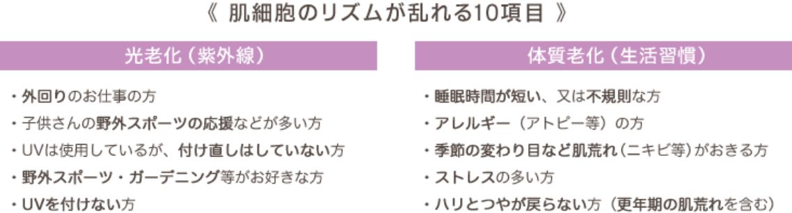 「肌時計」の乱れを分かり易くいうと「お肌が時差ボケ」を起こした状態です。 肌時計が乱れていると、何を使ってもお肌の改善がみられない残念なお肌になっている可能性があります。
